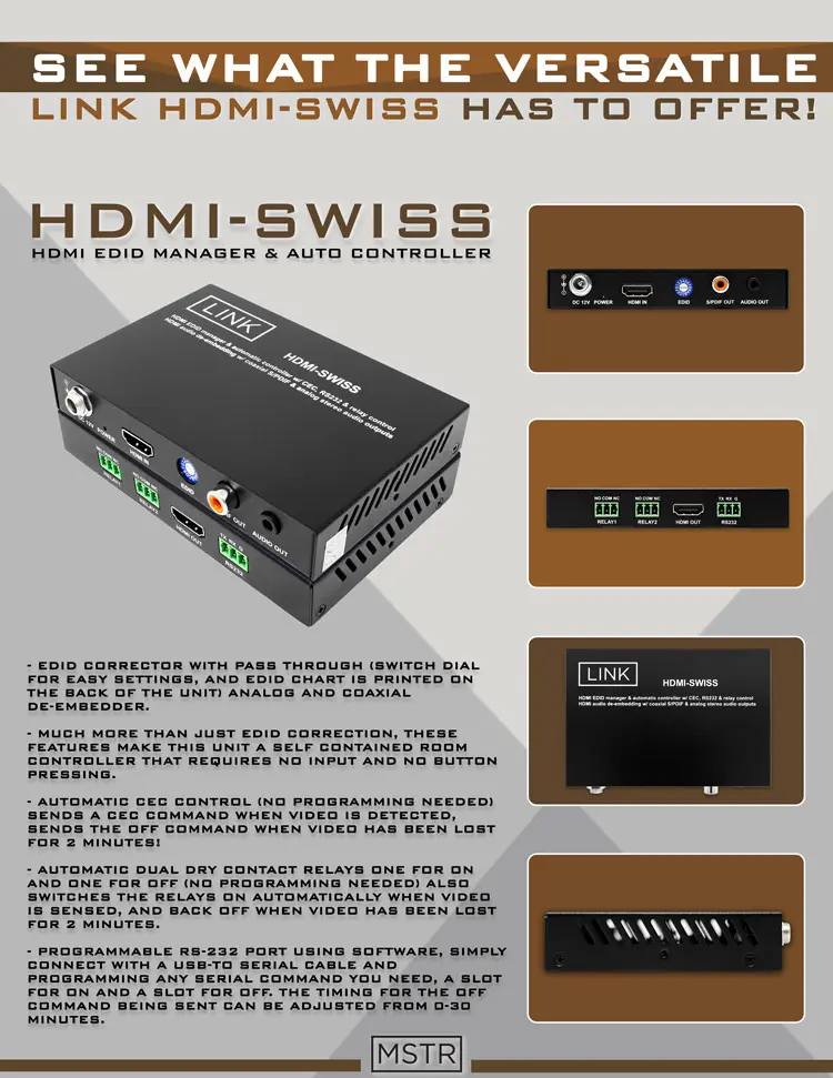 Introducing the LINK HDMI-SWISS HDMI EDID Manager & Auto Controller, a versatile and powerful device designed to streamline your HDMI audiovisual setup. This innovative tool empowers you with complete control over HDMI Extended Display Identification Data (EDID), ensuring optimal compatibility and performance between your HDMI devices.